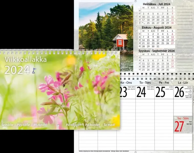 Kätevä Viikkoallakka Pöydälle Tai Seinälle; Kaksikielinen (Suomi-Ruotsi); Nimipäivät; Koko Avattuna 25X17 Cm; Säilytystasku; Avainlipputuote
