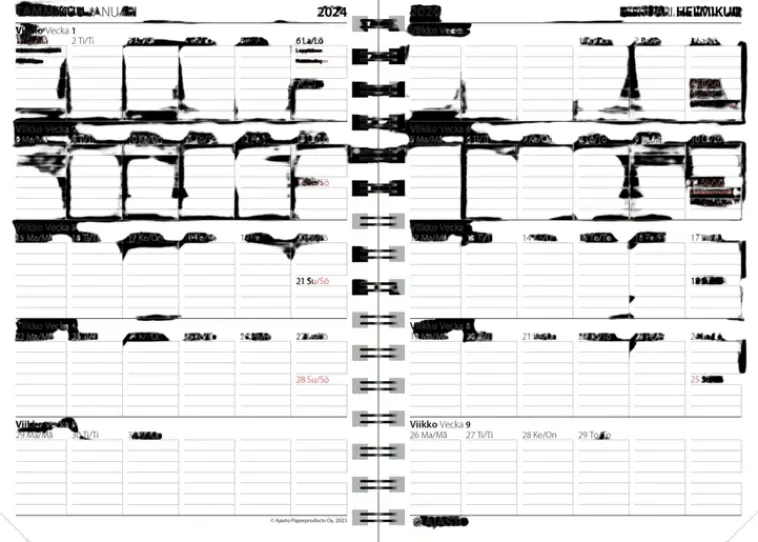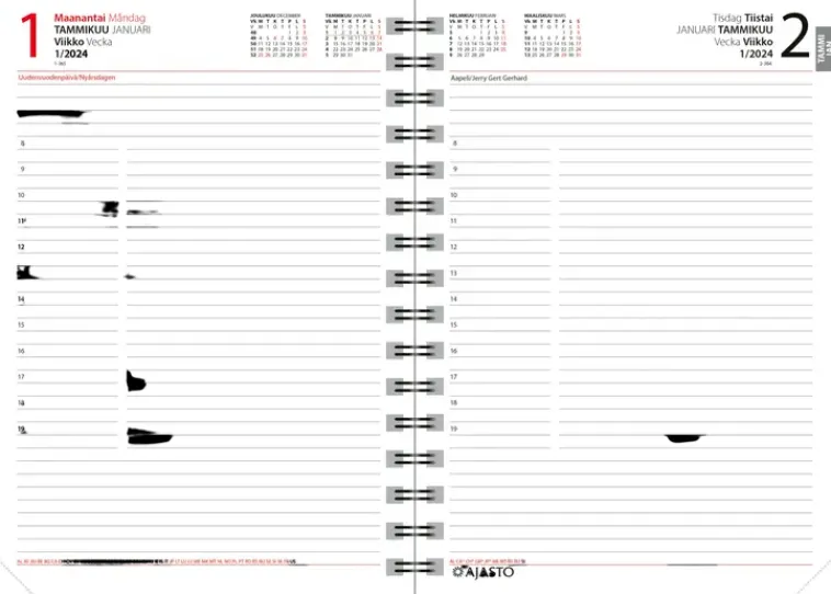 Kun Kaipaat Tilaa Päiväkohtaisille Muistiinpanoille. Koko 148 X 210 Mm (A5); Parikierresidottu; Kielisyys: Suomi, Ruotsi; Sivulla Päivänäkymä; Päiväkirja 52/2023–1/2025; Vuosisuunnitelmat 2024 Ja 2025; Kansalliset Vapaapäivät; Suomalaiset Ja Suomenruotsalaiset Nimipäivät; Välimatkataulukko; Muistiinpanosivuja; Kynänpidike; Fsc®-Sertifioitu Tuote.