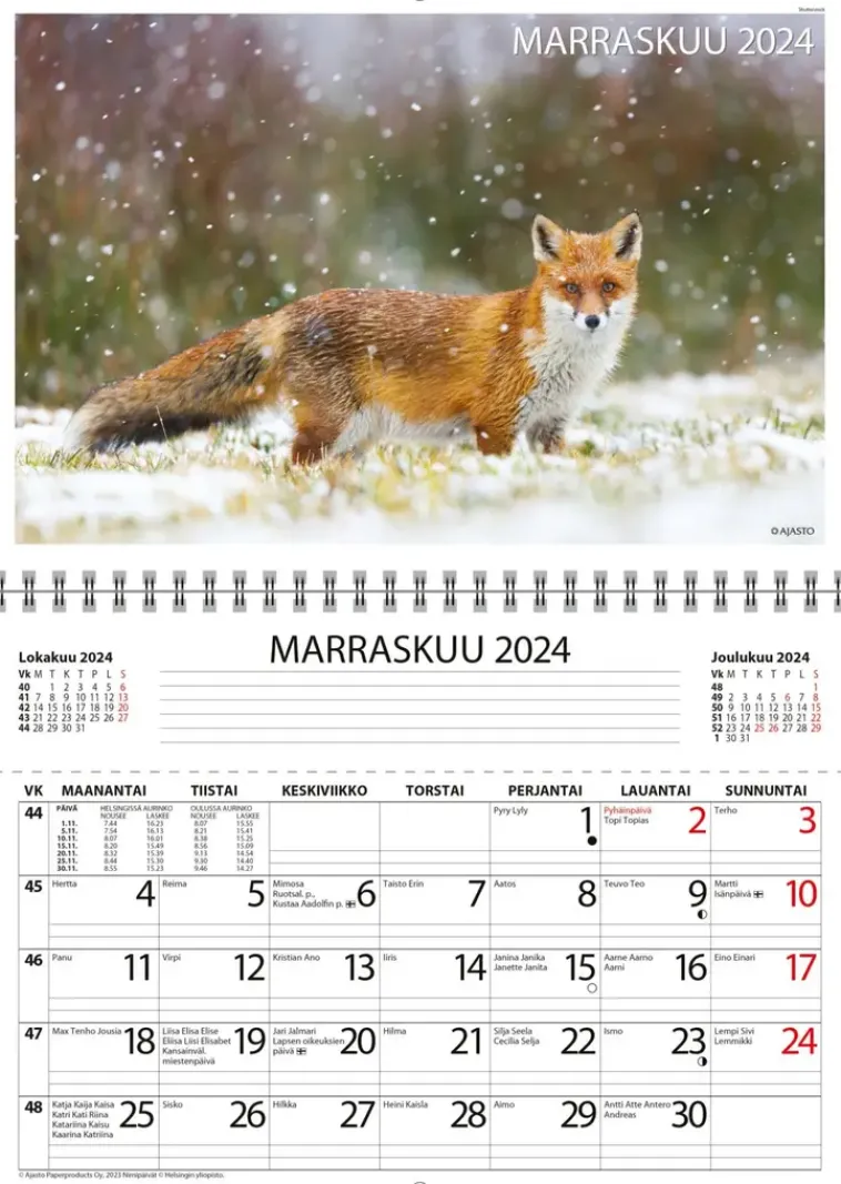 Suomen Suosituin Seinäkalenteri. Koko 250 X 176 Mm, Avattuna 250 X 352 Mm; Parikierresidottu; Joka Kuukaudelle Säilytystasku; Auringon Nousu- Ja Laskuajat (Helsinki, Oulu); Kalenterin Lopussa Ylimääräinen Tasku Mm. Säilytettäville Kuiteille; Värillinen Suomen Kartta; Soveltuu Hyvin Postitettavaksi Kirjekuoressa; Nimi- Ja Juhlapäivät; Fsc®-Sertifioitu Tuote.