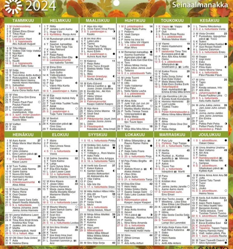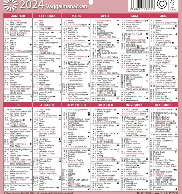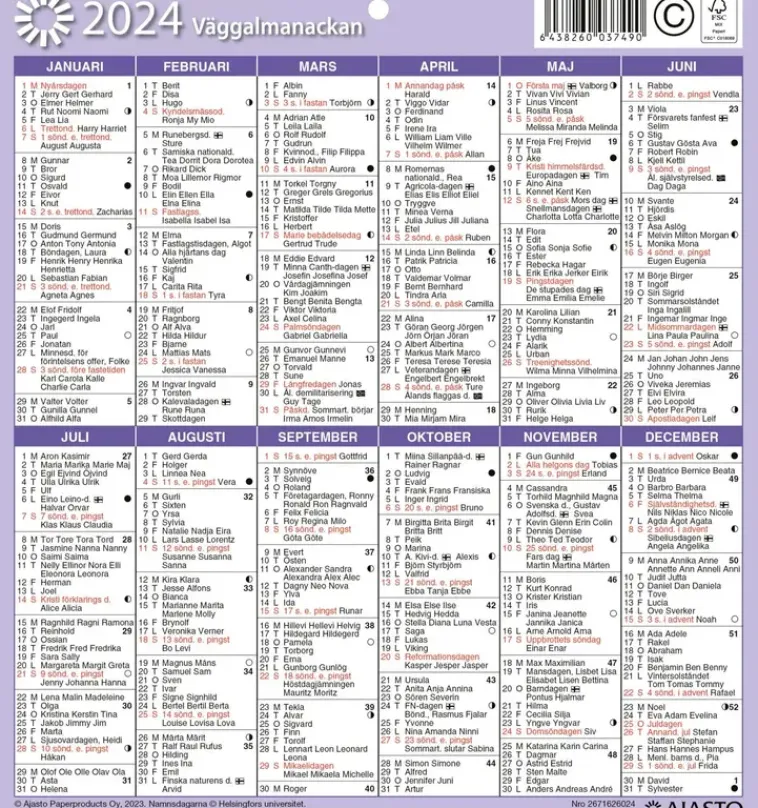 Suosittu Taulukkokalenteri, Kuvio- Ja Värivaihtoehdoilla. Koko 197 X 210 Mm; Kielisyys: Suomi, Ruotsi; Kirkkopyhät; Runsaasti Nimipäiviä; Ripustusreikä; Neljä Eri Vaihtoehtoa: Violetti, Punainen Sekä Kaksi Kuvallista Kalenteria; Fsc®-Sertifioitu Tuote.