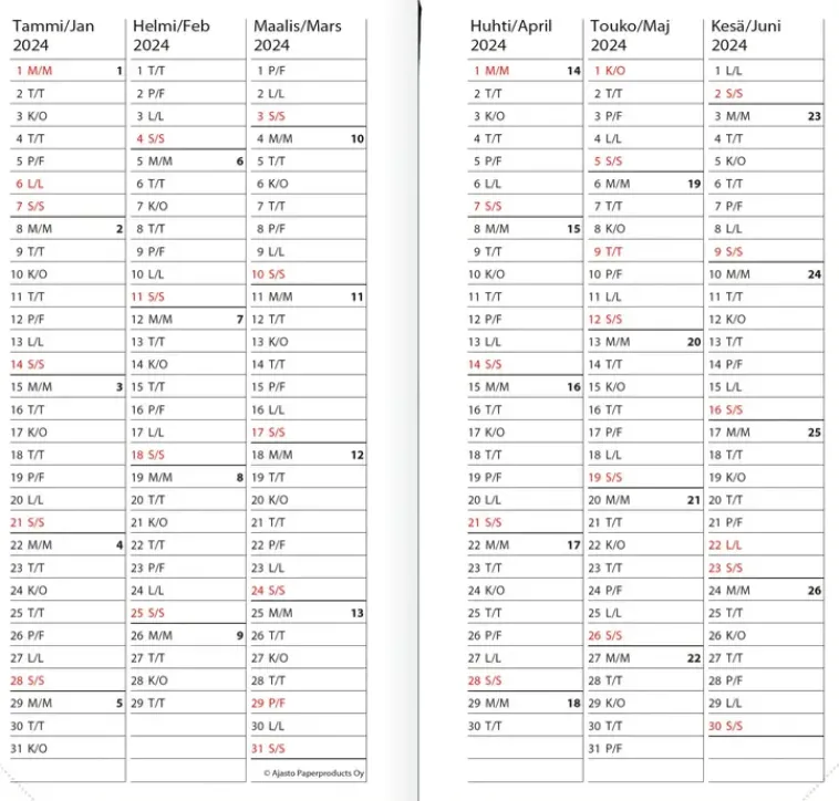 Kompakti Ajanhallinnan Mestari Kaksikielisenä. Koko 85 X 162 Mm; Leatherette-Kannet; Sidottu; Kielisyys: Suomi, Ruotsi; Kaksiviikkoinen Kalenteriaukeama Vaakana; Päiväkirja 48/2023–7/2025; Vuosisuunnitelmat 2024 Ja 2025; Liputuspäivät Suomessa; Kansalliset Vapaapäivät Päiväkirjan Sivuilla Ja Taulukkona; Suomalaiset Ja Suomenruotsalaiset Nimipäivät; Välimatkataulukko; Muistiinpanotilaa; Fsc®-Sertifioitu Tuote.