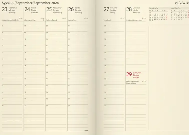 Keinonahkakansi, Kuminauhalla. Säilytystasku Takakannessa. Kalenterin Aukeamalla Yksi Viikko, Tuntijaotus 08-20, Palsta Muistiinpanoille, Kuluvan Ja Seuraavan Kuukauden Kalenteritaulukot. Kalenteri Sisältää Nimipäivät, Juhlapyhät, Liputuspäivät, Kuun Vaiheet, Vuosisuunnitelmat Kuluvalle Ja Seuraavalle Vuodelle Ja Runsaasti Muistiinpanosivuja. Kalenteriosa: Vk 52 2023-Vk 1 2025. Kolmikielinen: Suomi/Ruotsi/Englanti. Sidottu. Kermanvärinen Paperi. Koko: 148X210 Mm (A5).