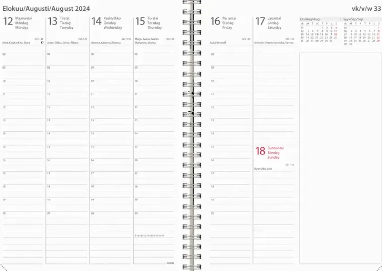Pellavatekstiilikansi. Kalenterin Aukeamalla Yksi Viikko, Tuntijaotus 08-20, Palsta Muistiinpanoille, Kuluvan Ja Seuraavan Kuukauden Kalenteritaulukot. Kalenteri Sisältää Nimipäivät, Juhlapyhät, Liputuspäivät, Kuun Vaiheet, Vuosisuunnitelmat Kuluvalle Ja Seuraavalle Vuodelle, Vuosiruudukot Edelliselle, Kuluvalle Ja Kahdelle Seuraavalle Vuodelle, Kalendaariset Tiedot, Auringon Nousu- Ja Laskuajat, Yleiset Pyhäpäivät Maailmalla Ja Muistiinpanosivut. Kalenteriosa: Vk 48 2023-Vk 1 2025. Kolmikielinen: Suomi/Ruotsi/Englanti. Parikierresidottu. Koko: 148X210 Mm (A5).