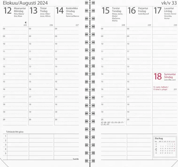 Kalenterin Aukeamalla Yksi Viikko Ja Kuluvan Kuukauden Kalenteritaulukko, Tuntijaotus 08-20. Kalenteri Sisältää Nimipäivät, Kansalliset Pyhäpäivät, Liputuspäivät, Kuun Vaiheet, Vuosisuunnitelmat Kuluvalle Ja Seuraavalle Vuodelle, Vuosiruudukot Kuluvalle Ja Seuraavalle Vuodelle, Yleiset Pyhäpäivät Euroopassa, Kalendaariset Tiedot, Suomen Kartta, Välimatkataulukon Ja Erillisen Puhelinmuistion. Kalenteriosa: Vk 52 2023-Vk 1 2025. Kaksikielinen: Suomi/Ruotsi. Parikierresidottu. Fsc®. Koko 83X158 Mm.