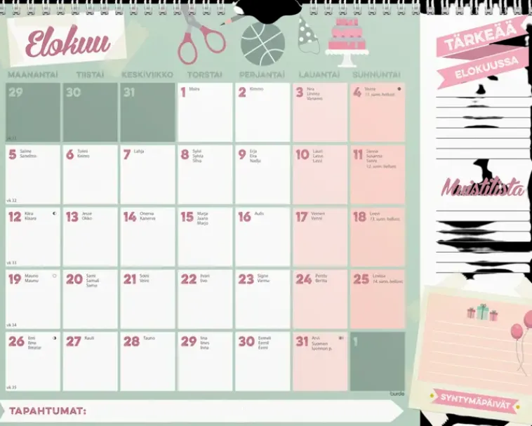 12 Sivua. Mia Hortonin Suunnittelema Kuukausikalenteri Koko Perheelle. Kalenteri Sisältää Nimipäivät, Kansalliset Pyhääivät, Liputuspäivä Ja Kuun Vaiheet. Parikierresidottu. Suomenkielinen. Fsc®. Koko: 350X270 Mm.
