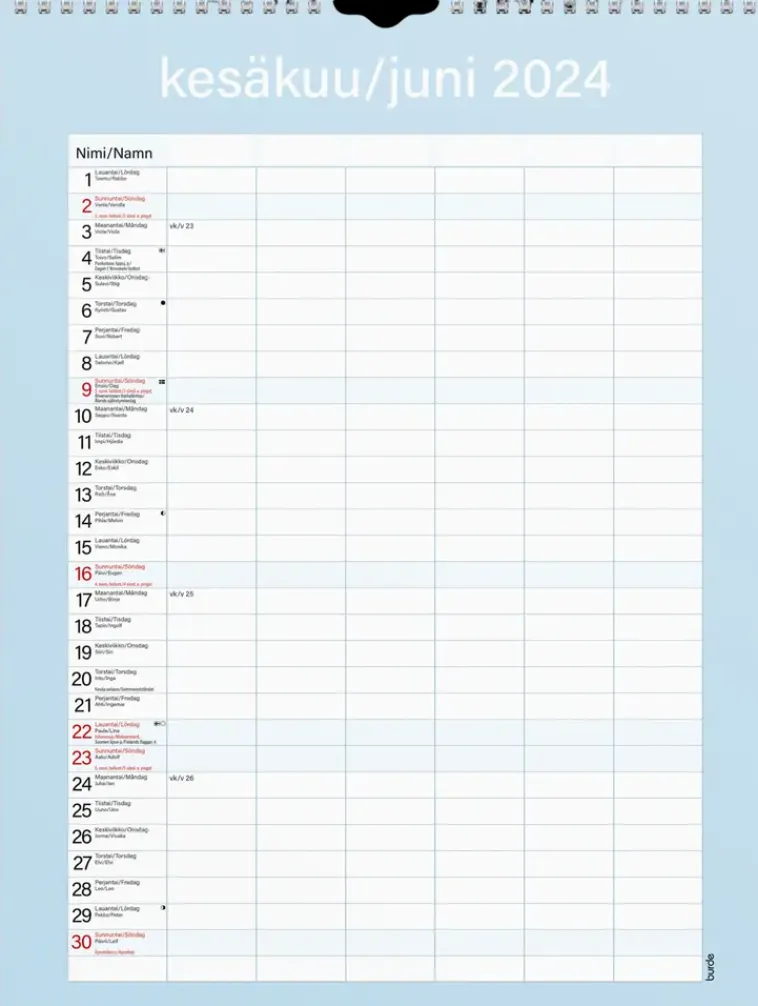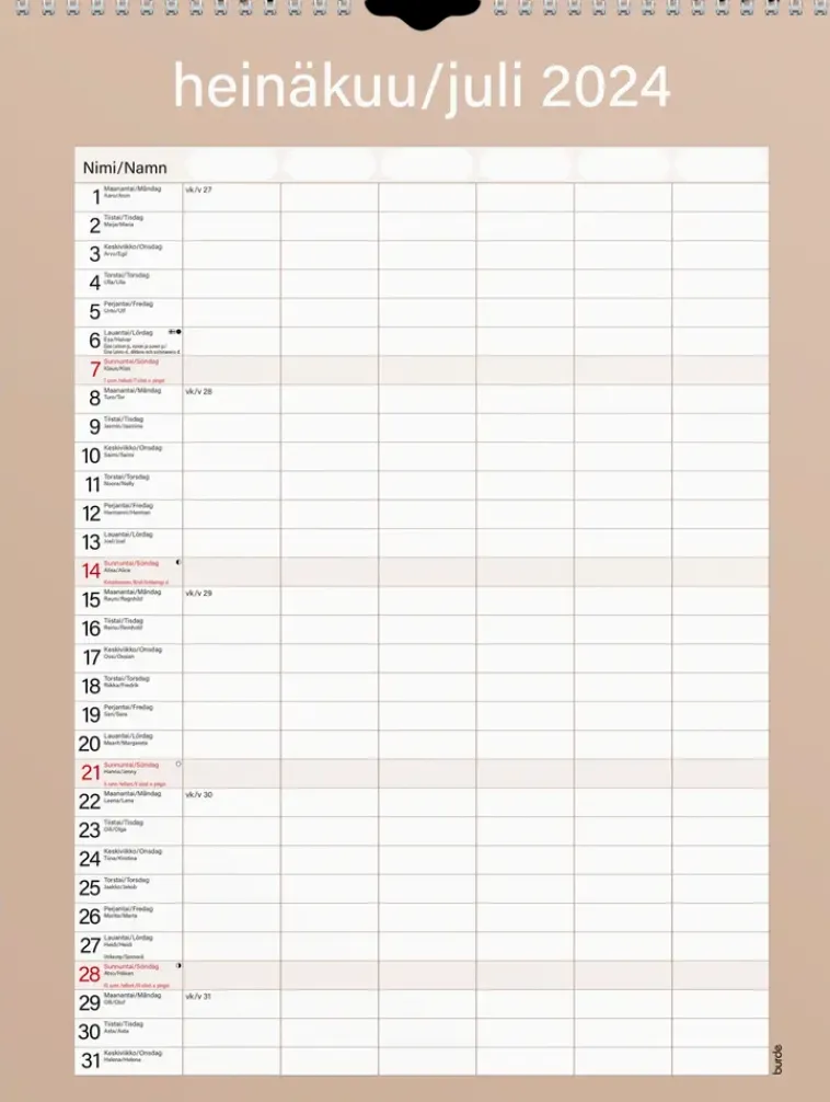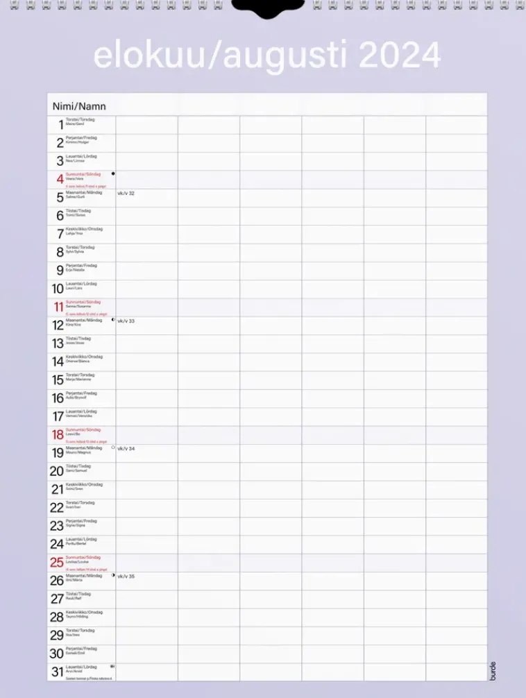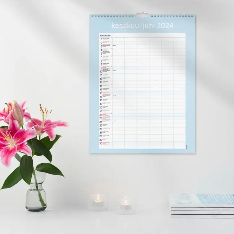 12 Sivua. Yksinkertainen Seinäkalenteri Koko Perheen Menoille. Kuudella Sarakkeella. Kalenteri Sisältää Nimipäivät, Liputuspäivät, Kansalliset Pyhäpäivät Ja Kuun Vaiheet. Kaksikielinen: Suomi/Ruotsi. Parikierresidottu. Fsc®. Koko: 295X390 Mm.