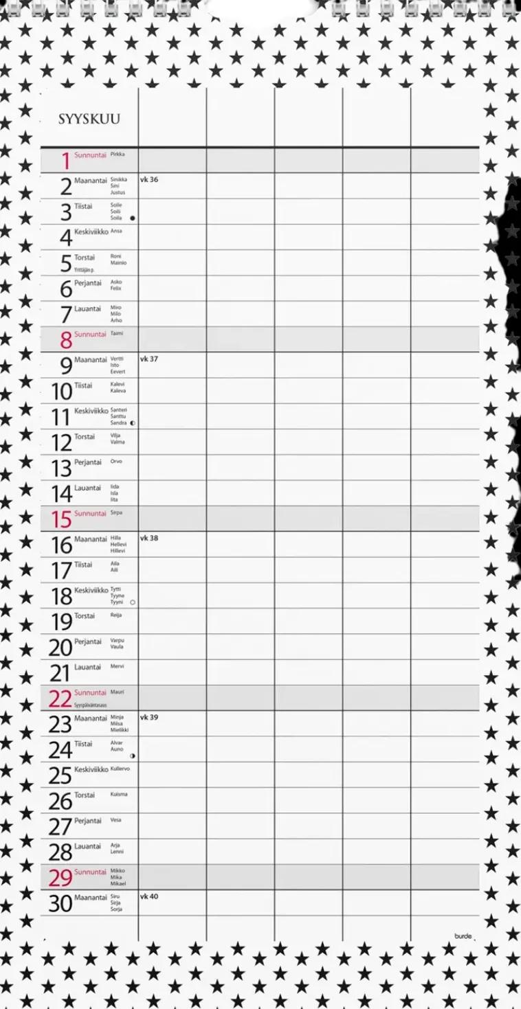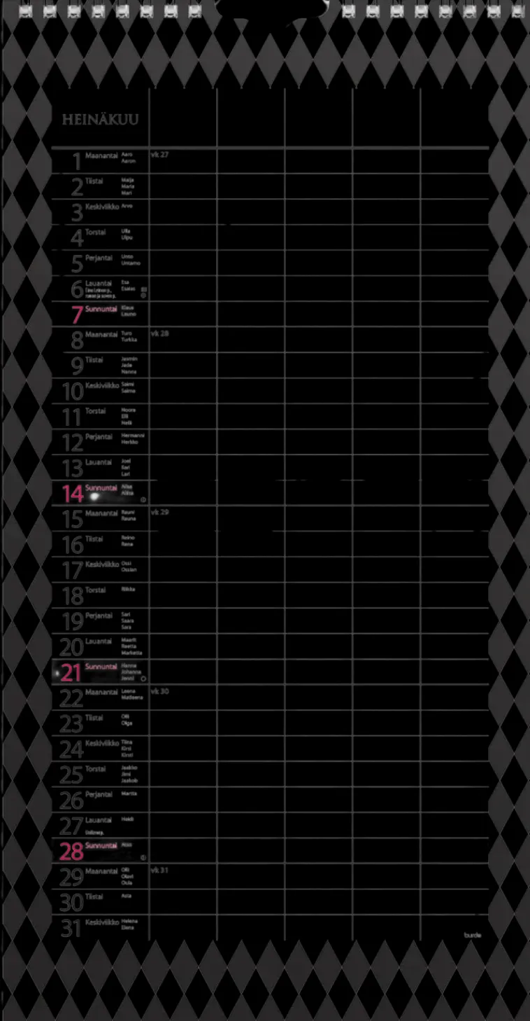 12 Sivua. Moderni Suunnitelmakalenteri Viidellä Sarakkeella. Kätevä Paperitasku Tärkeille Papereille Ja Kynänpidike. Kalenteri Sisältää Nimipäivät, Liputuspäivät, Kansalliset Pyhäpäivät Ja Kuun Vaiheet. Suomenkielinen. Parikierresidottu. Fsc®. Koko: 220X430 Mm (Ilman Paperitaskua).