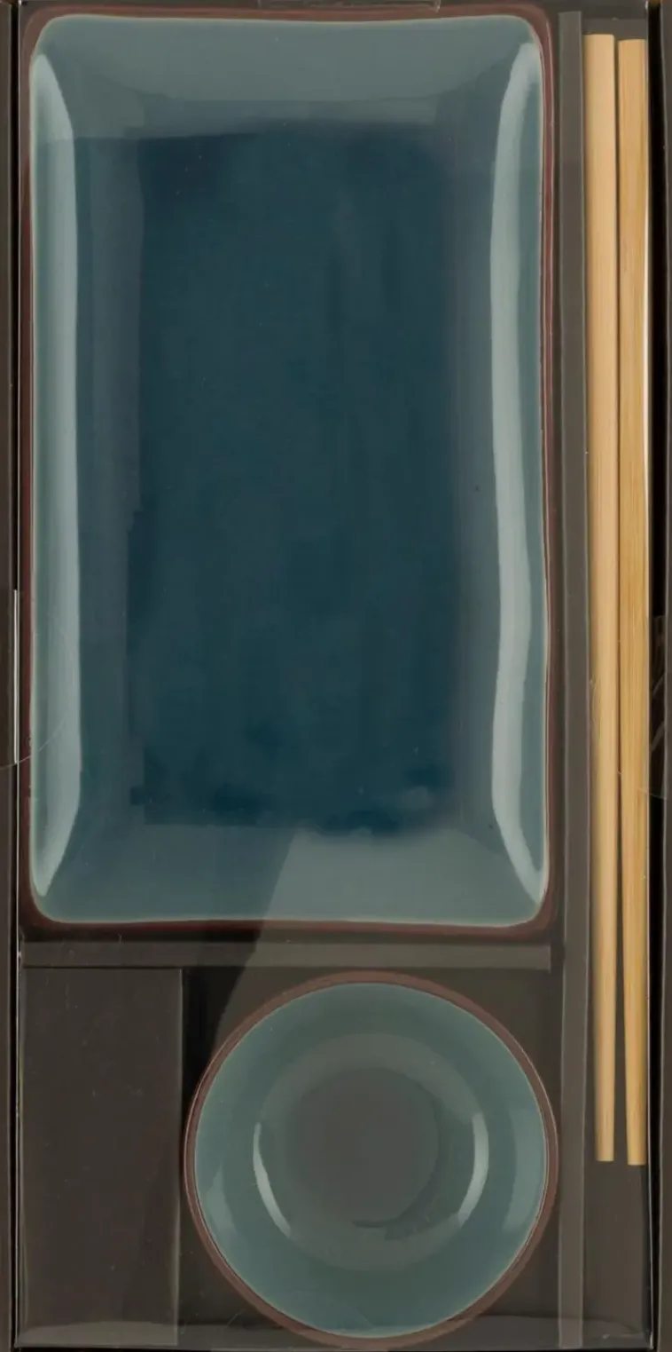 Kolmiosainen Sushi-Tarjoilusetti, Jossa Sushilautanen, Dippilautanen Ja Syömäpuikot. Lautaset Ovat Kivitavaraa Ja Syömäpuikot Bambua. Mitat: Lautanen 19,5 X 11,5 X 2 Cm, Kulho 8 X 8 X 3 Cm Ja Syömäpuikot 24 X 0,7 Cm. Lautaset Ja Syömäpuikot Tulee Pestä Käsin.
