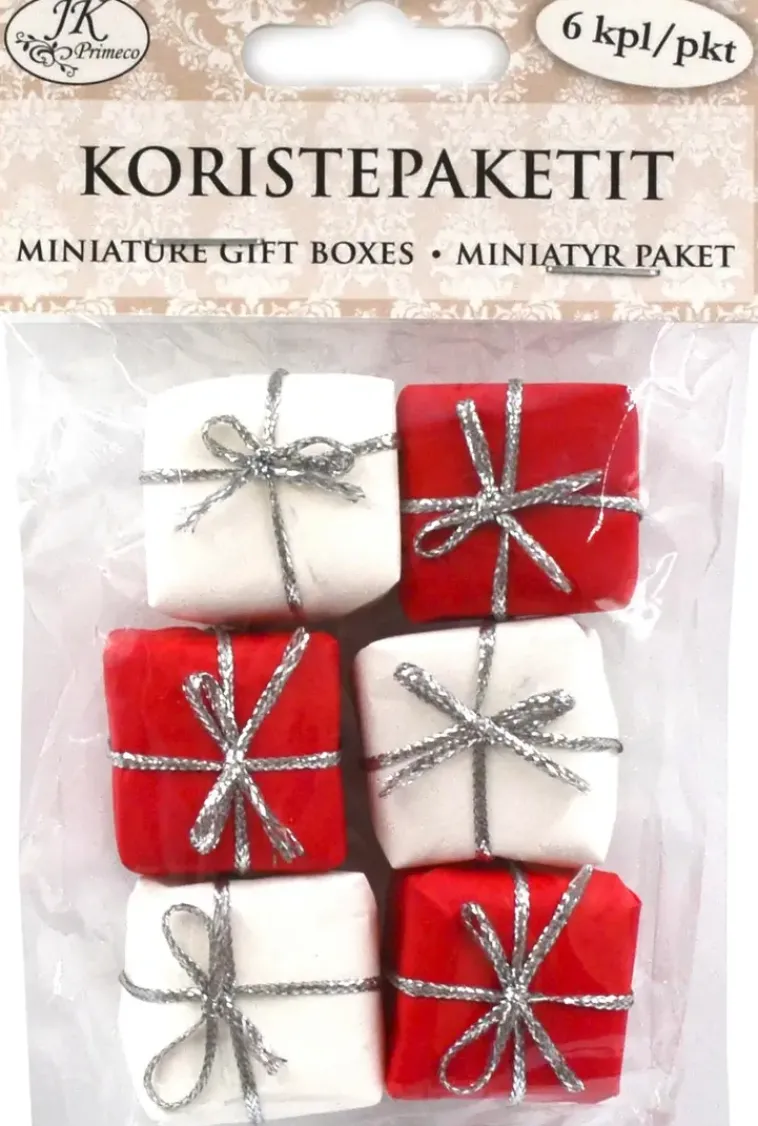Koristepaketit Koristeluun Ja Minimaailman Rakentamiseen. Pakkaus Sisältää Kuusi Kappaletta Muovisia Koristepaketteja, Jotka On Kääritty Paperiin Ja Ympärillä On Hopeinen Nauha. Yhden Paketin Koko On Noin 3Cm X 3Cm.