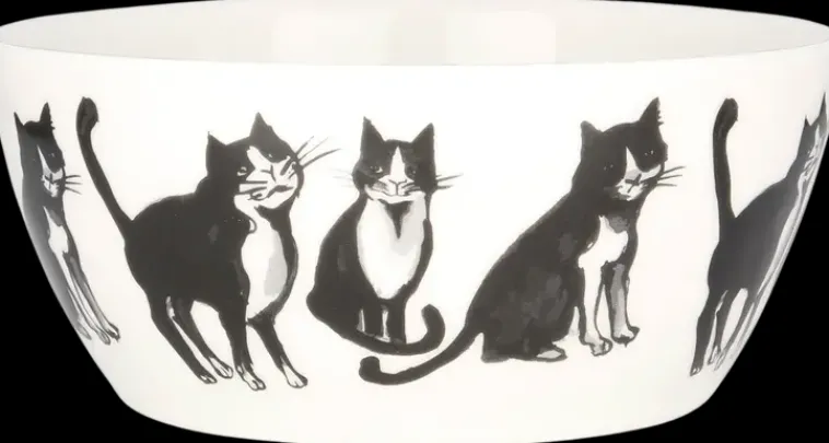 Mustavalkoisissa Kissan Ystävät Astioissa Venyttelee Notkeat Kissat. Kulho On Valmistettu Korkealaatuisesta Vitroposliinista.