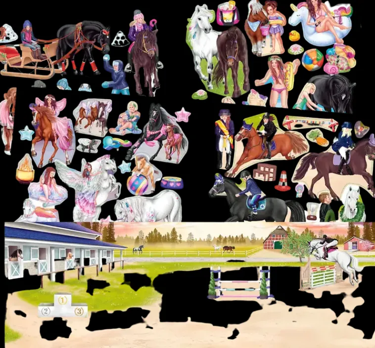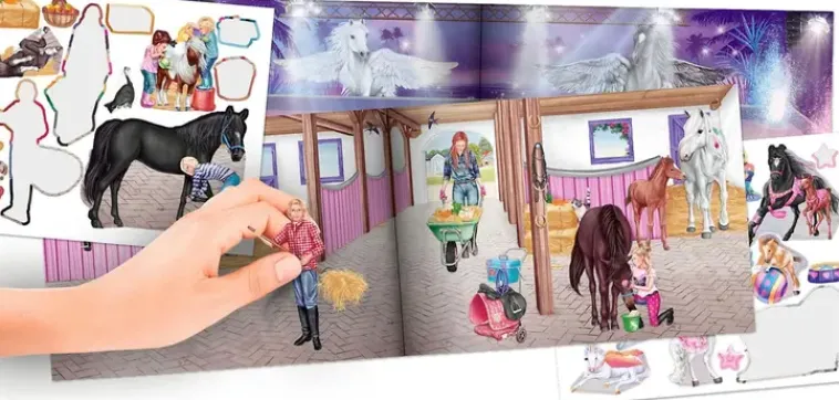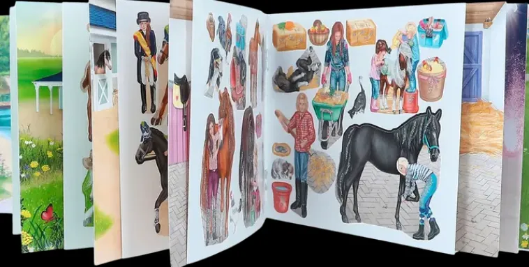 Kätevän Kokoisessa Kirjassa Useita Erilaisia Talliaiheisia Sivuja, Jotka Voit Koristella Mukana Tulevien Kauniiden Tarrojen Avulla. Kirjassa Mukana Paljon Tarroja!