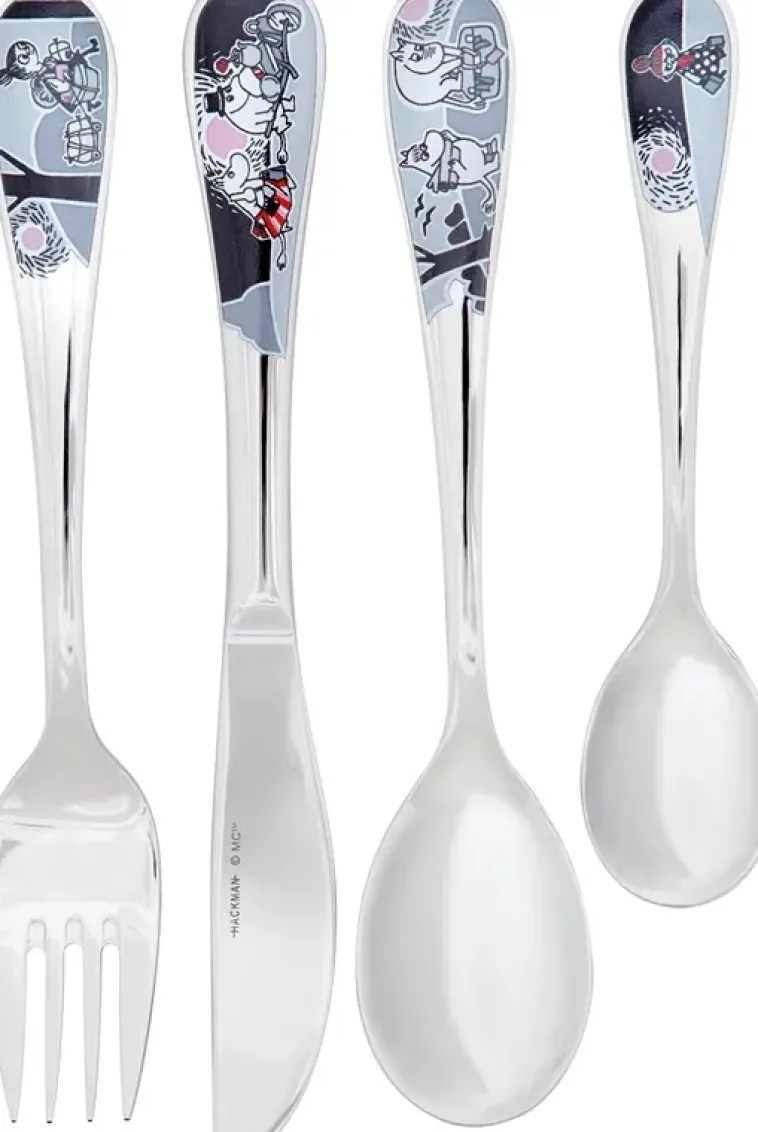 Muumi Seikkailu Muutto -Aterinsetti Sisältää Lasten Haarukan, Veitsen, Ruokalusikan Sekä Kahvilusikan. Aterinten Pituus N. 17 Cm, Kahvilusikan Pituus 13,4 Cm. Aterimissa 4 Erilaista Seikkailu Muutto -Sarjan Kuvitusta. Ruostumatonta Terästä.