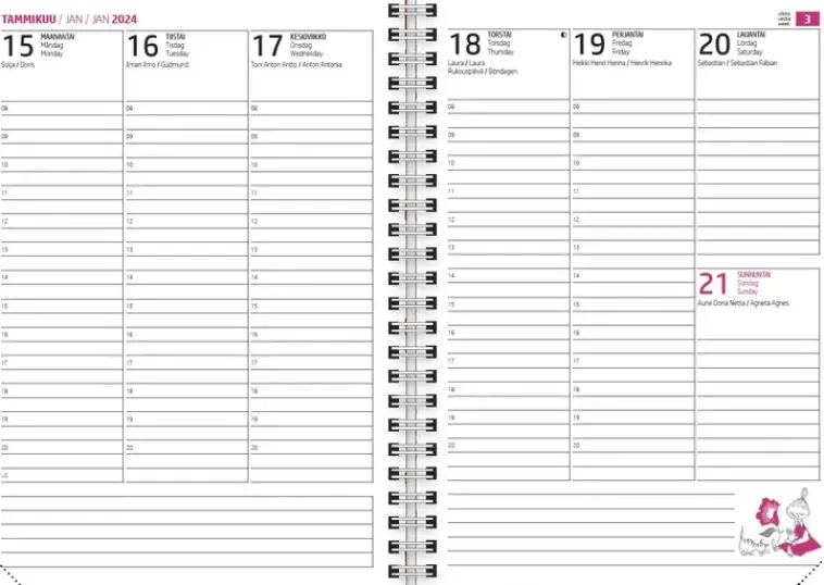 Tässä Kartonkikantisessa Kierresidotussa Mallissa On Kolmikielinen Viikkonäkymä 12 Kuukauden Sisällöllä, 48/2023-1/2025. Kielet Suomi, Ruotsi Ja Englanti. Suomalaiset Nimi- Ja Juhlapäivät. Löydät Aukeamilta Muumilaakso-Animaation Hahmojen Alkuperäisluonnoksia. Sisältää Vuosisuunnitelman, Liputuspäivät, Suomenkieliset Nimipäivät, Tehtävälistoja Ja Runsaasti Muistiinpanotilaa, Sekä Viivoilla Että Ruuduilla. Valmistettu Fsc-Sertifioidusta Paperista.