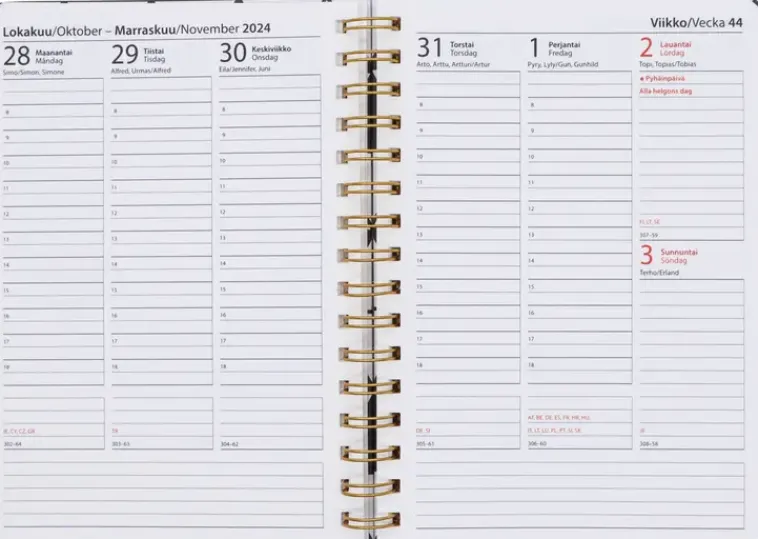 Kovakantinen, Kierresidottu Pöytäkalenteri Kuminauhalla. Koko: A5. Kielisyys: Suomi, Ruotsi. 192 Sivua.