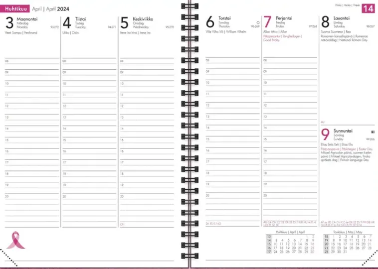 Tue Roosanauha -Kampanjaa Hankkimalla Upea, Jo Klassikoksi Muodostunut Kalenteri Vuodelle 2024! Myyntituotosta Lahjoitetaan 10% Osuus Syöpäsäätiölle Erilaisten Syöpien Vastaiseen Työhön Ja Tutkimukseen. A5 Kokoinen Parikierresidottu Malli Viikkoaukeamalla Ja Kuvioiduilla Keinonahkakansilla. Kolmikielinen Sisältö: Suomi, Ruotsi Ja Englanti. Kalenteri Alkaa Viikosta 49/2023 Ja Päättyy Viikkoon 1/2025. Kalenterissa On Monia Hyödyllisiä Ominaisuuksia, Kuten Taittuva Etukansi, Viikkoaukeama, Yhteystietokortti Ja Vuosikatsaus. Kalenteriosuudessa Mukana Liputus- Ja Juhlapäivät, Vuosisuunnittelu-Osio, Suomen Ja Ruotsinkieliset Nimipäivät, Kansainväliset Vapaapäivät, Ja Uutena Syntymäpäivä- Ja -Lahjasivut. Reilusti Viivoitettua Muistiinpanotilaa. Takakannessa Kaksinkertainen Muovitasku Lipuille Ja Kuiteille. Sisäsivuilla Roosa Nauha -Logo Jokaisella Aukeamalla. Valmistettu Fsc-Sertifioidusta Paperista.