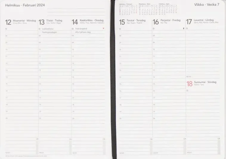 A5 Classic Pöytäkalenteri On Lankasidottu, Trendikkään Värisillä Ja Pehmustetuilla Keinonahkakansilla Päällystetty Kirjamallinen Kalenteri. Merkkinauhan Avulla Haluttu Viikko Löytyy Nopeasti. Irrallinen Muistio Takakannen Sisätaskussa, Jota Voi Käyttää Myös Kuittien Ja Papereiden Säilytykseen. Valmistettu Fsc-Sertifioidusta Paperista. · Lankasidottu · Sivukoko A5 – 148 X 210 Mm · Kaksikielinen: Suomi, Ruotsi · Viikot 45/2023 – 52/2024 · Kuukausikalenterit 2024 Ja 2025 · Vuosikalenterit 2024 Ja 2025 · Avattava Vuosisuunnitelma 2024 · Nimipäiväkalenteri 2024 · Liputuspäivät 2024 · Kansalliset Pyhäpäivät 2024 · Ulkomaan Suuntanumerot · Tehtäväluettelot · 8-Sivuinen Maailmankartasto ·
