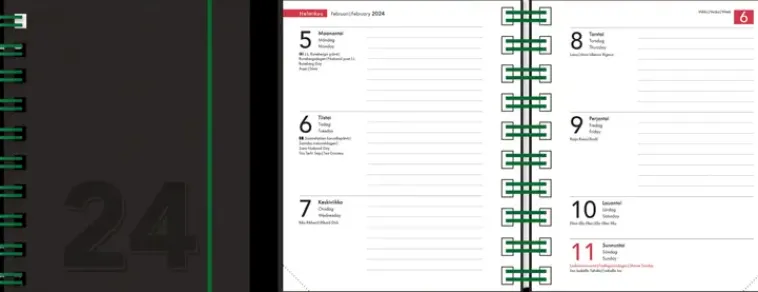 Sivukoko 120 X 150 Mm, Viikot 49/2023-1/2025, Vuosisuunnittelut 2024 Ja 2025. Aukeamalla Viikko, Runsaasti Päiväkohtaista Kirjoitustilaa. Selkeät Ja Suuret Kalenteriaukeamat Helpottavat Päivittäisten Muistiinpanojen Tekoa. Wiresidottu, Kulmaperforointi, Tukevat Mustat Kierrätyskartonkikannet. Kielisyys Suomi, Ruotsi Ja Englanti.