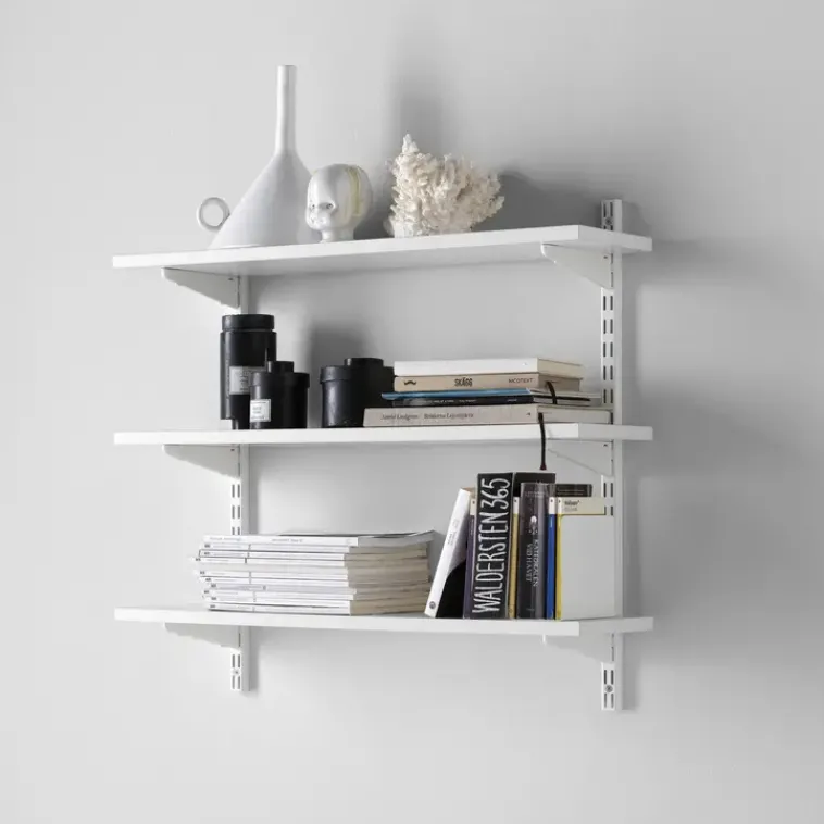 Elfa Säilytyskalusteet<Hyva Valmisratkaisu, Joka Sisaltaa Kaiken Mita Tarvitset Kolmen Hyllyn Kirjahyllyn Luomiseen. Plug-In -Teknologian Ja Seinakiskojen Reikien Ansiosta Helppo Asentaa Oikein Vatupassia Kayttaen.