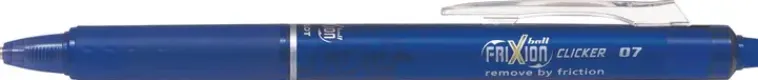 Frixion Ball Clicker Poispyyhittävä Ja Uudelleentäytettävä Mustekynä; Kynän Kärki On 0,7 Mm Ja Kirjoitusleveys 0,35 Mm; Kynässä On Thermo-Sensitiivinen Muste. Musteen Saa Häviämään +60 C Ja Sen Saa Takaisin -10C; Sopii Erinomaisesti Luonnosteluun Ja Ristisanatehtäviin; Ei Sovellu Virallisiin Asiakirjoihin; Väri Sininen